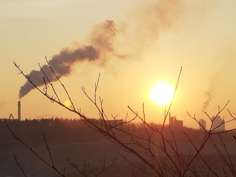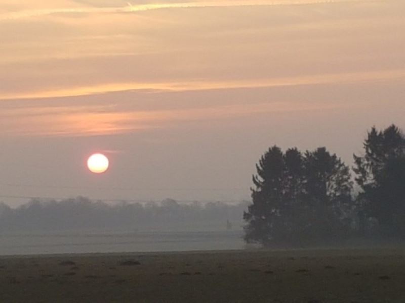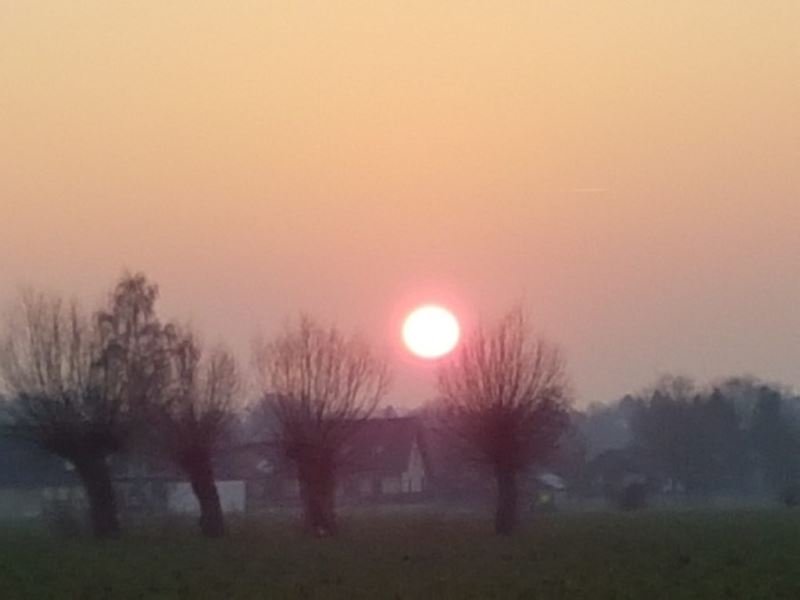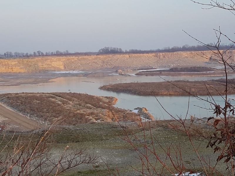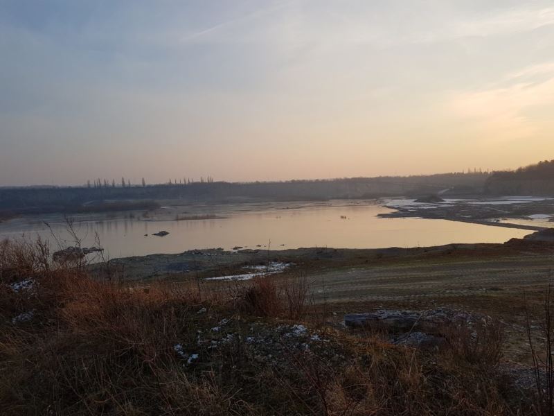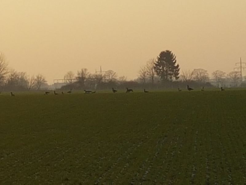 Tasso und ich waren unterwegs. Wir haben Gänse gesehen aber nicht gejagt. (Das sind die dunklen Punkte auf dem Bild.) Wir haben die zugefrorenen Seen im Steinbruch angeschaut und schließlich zwei mal den Sonnenuntergang. Über den Zementwerken und im Bruch. Schön war’s.