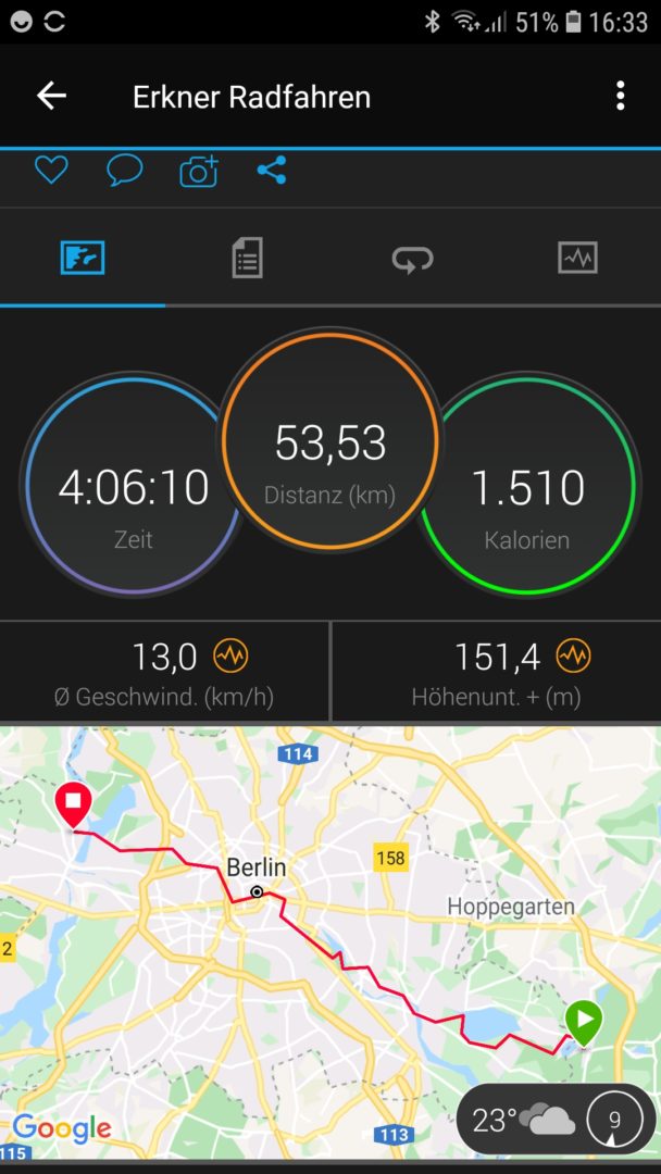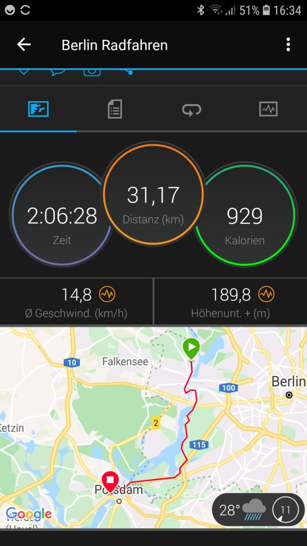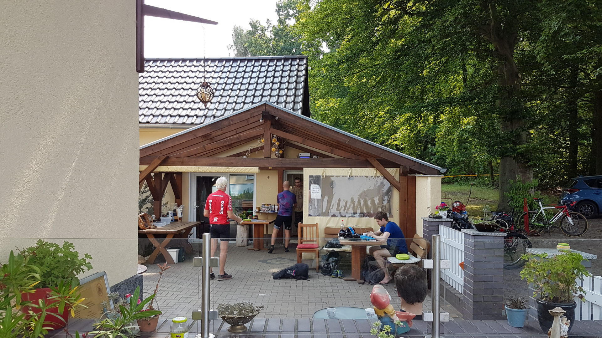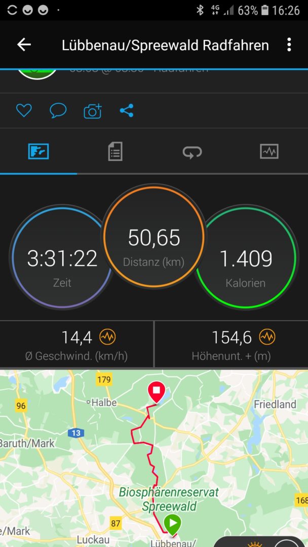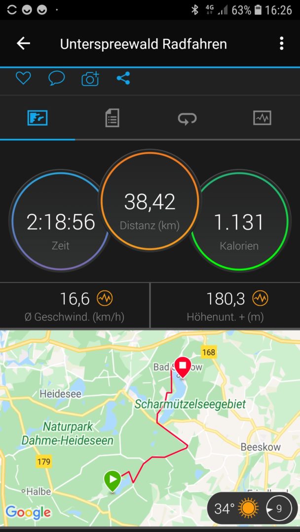 16.30 h Es waren 90 km. Leider vergesse ich nach Pausen immer wieder, das Navi anzustellen. Wir sind in Bad Saarow, Villa Ettel. Ein isotonisches Kaltgetränk sofort und eine Dusche danach.