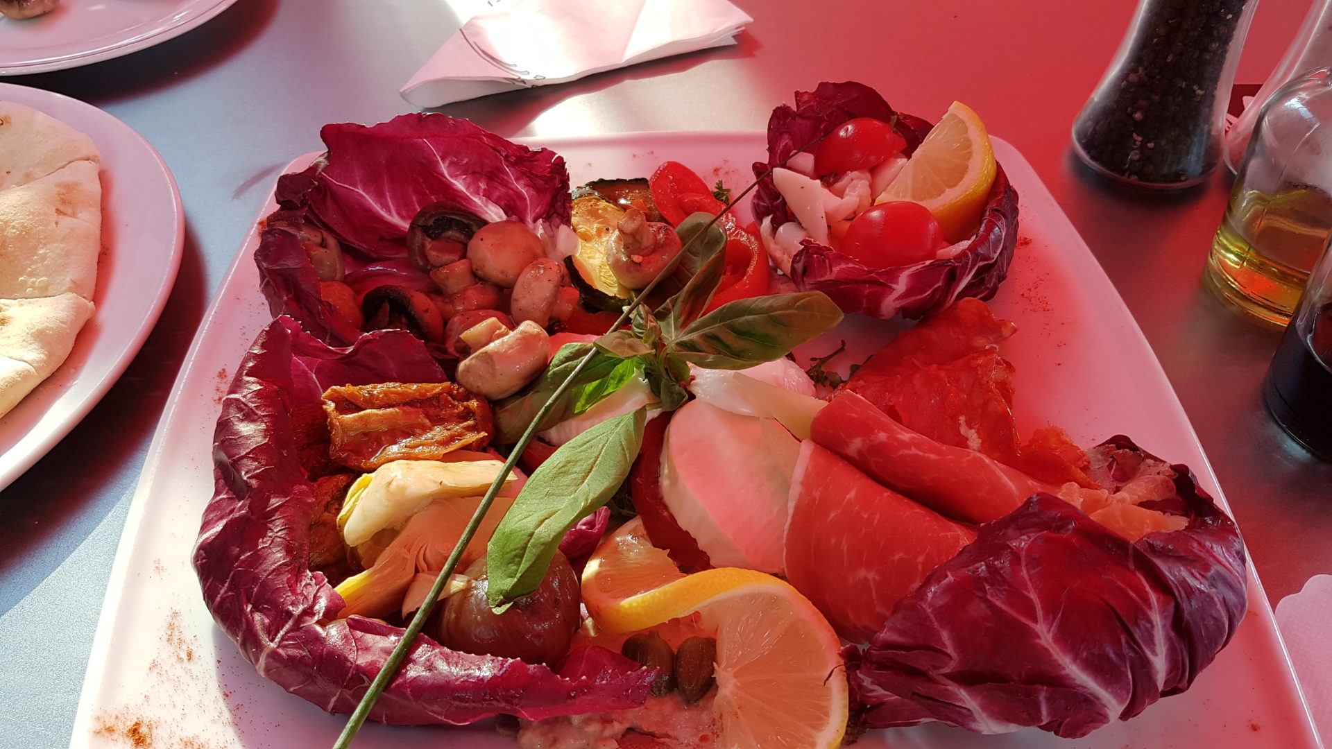 Wir hatten nochmal doppeltes Glück. Zum einen mit unserem italienischen Restaurant. Das Bild zeigt unsere Vorspeise, Antpasti. Mit alles.