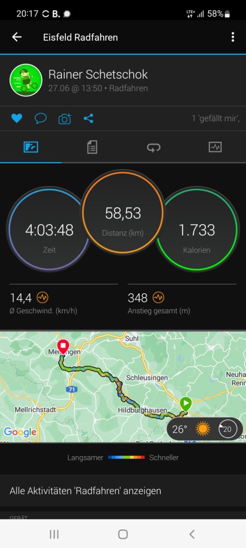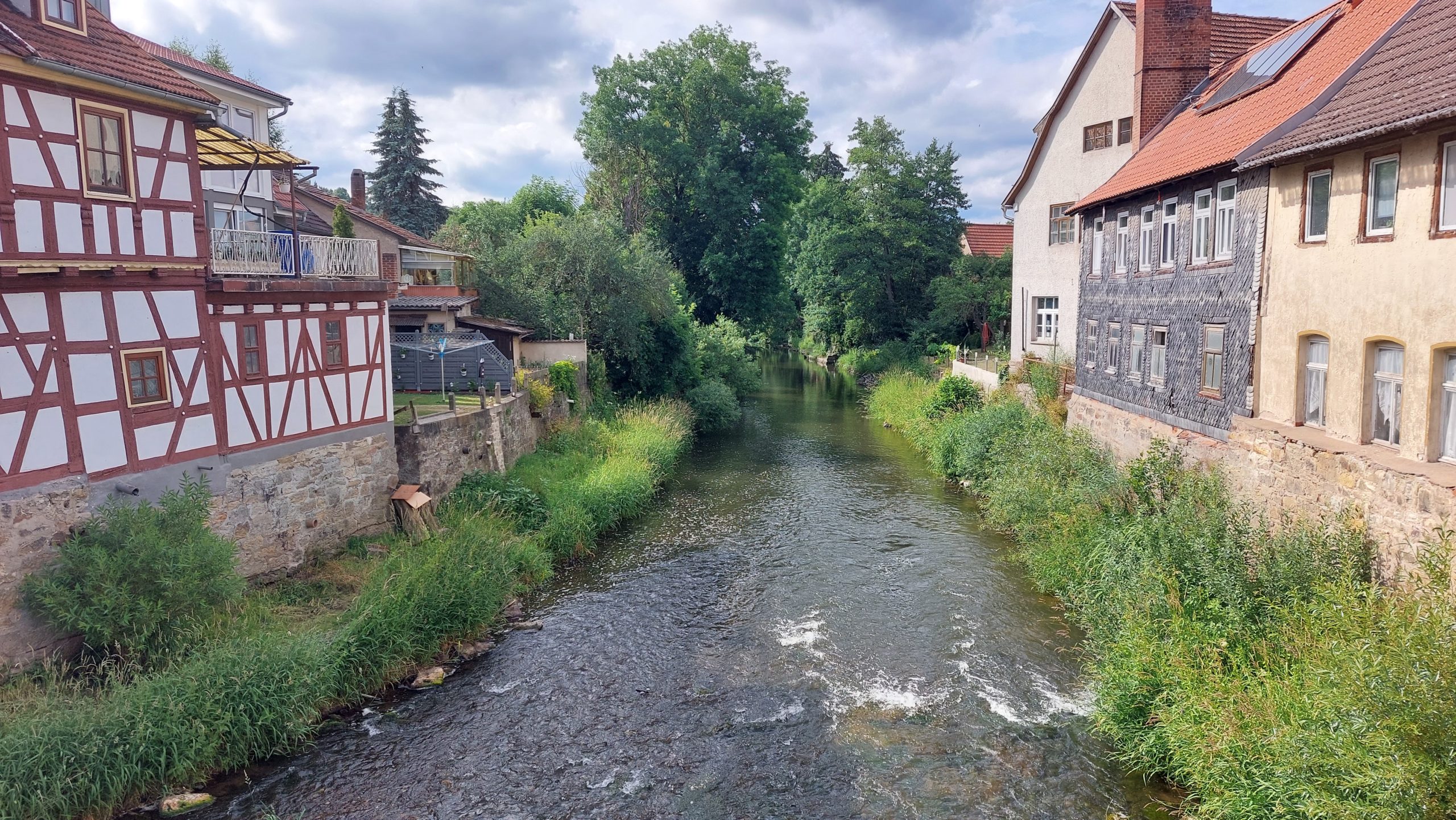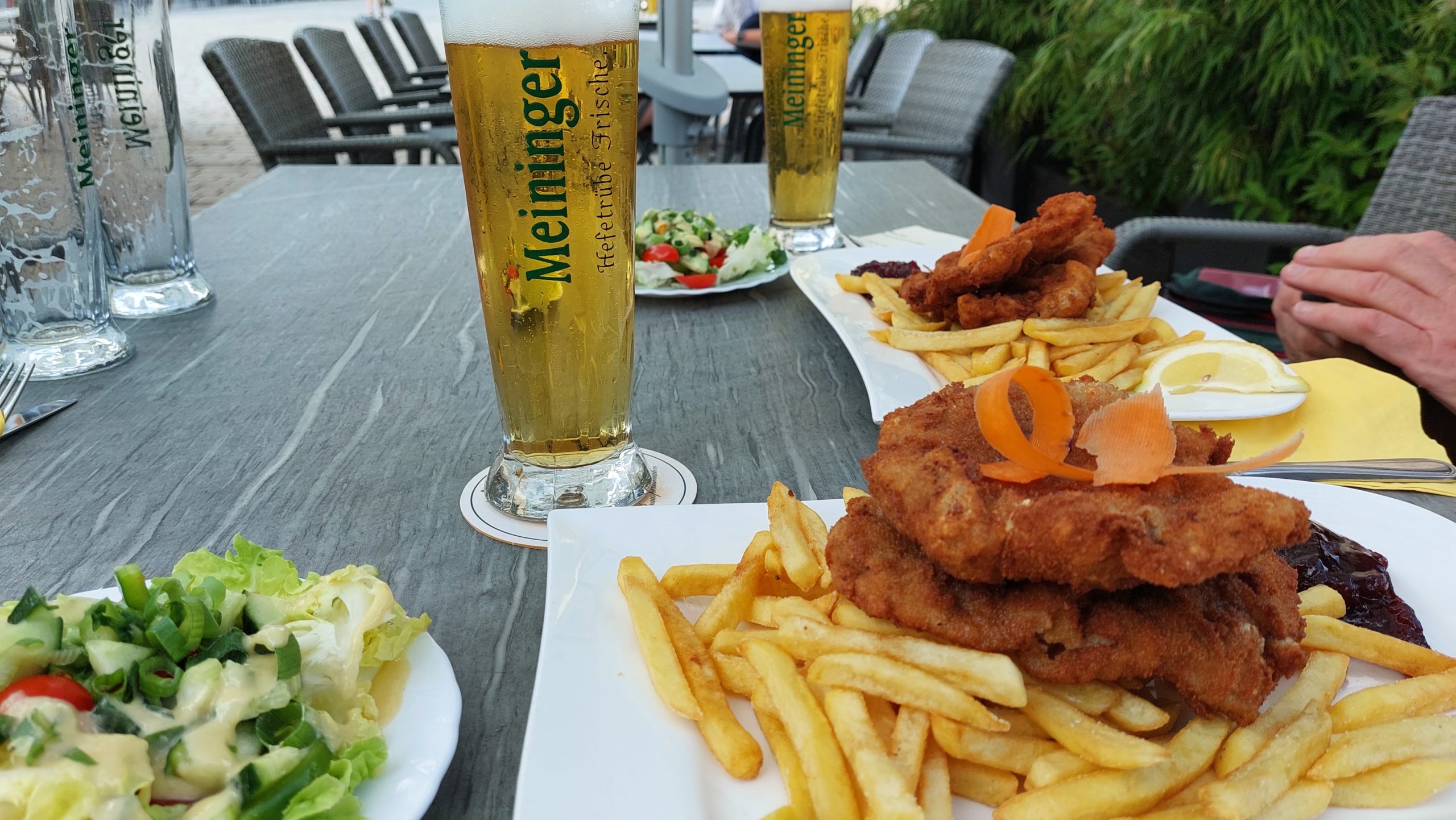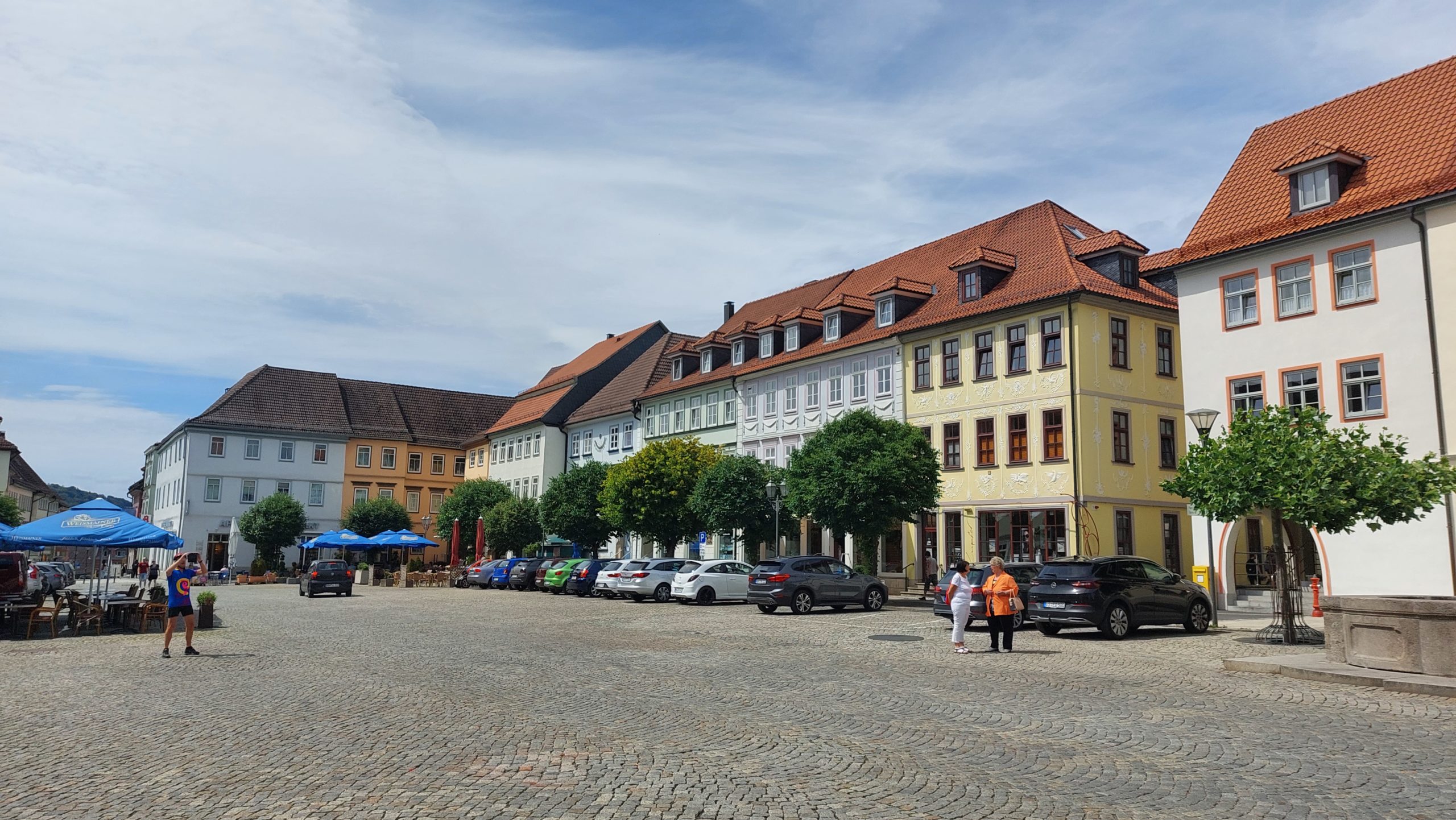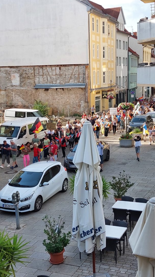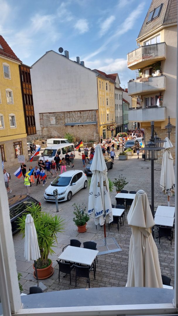 Nach 60 km und 4 1/2 Stunden sowie 4 mal Schieben sind wir in Meiningen angekommen. Kaputt aber glücklich, passt wie selten Dass wir dazu hier noch in die Montagsdemo geraten sind … . Doch jetzt erstmal frisch machen und ein Lokal suchen.