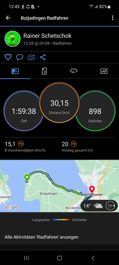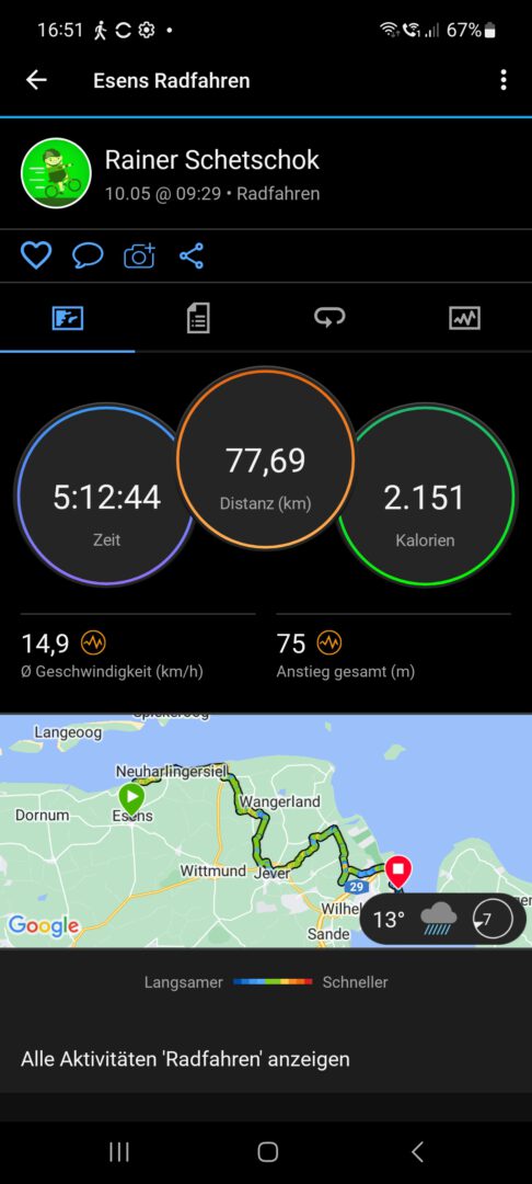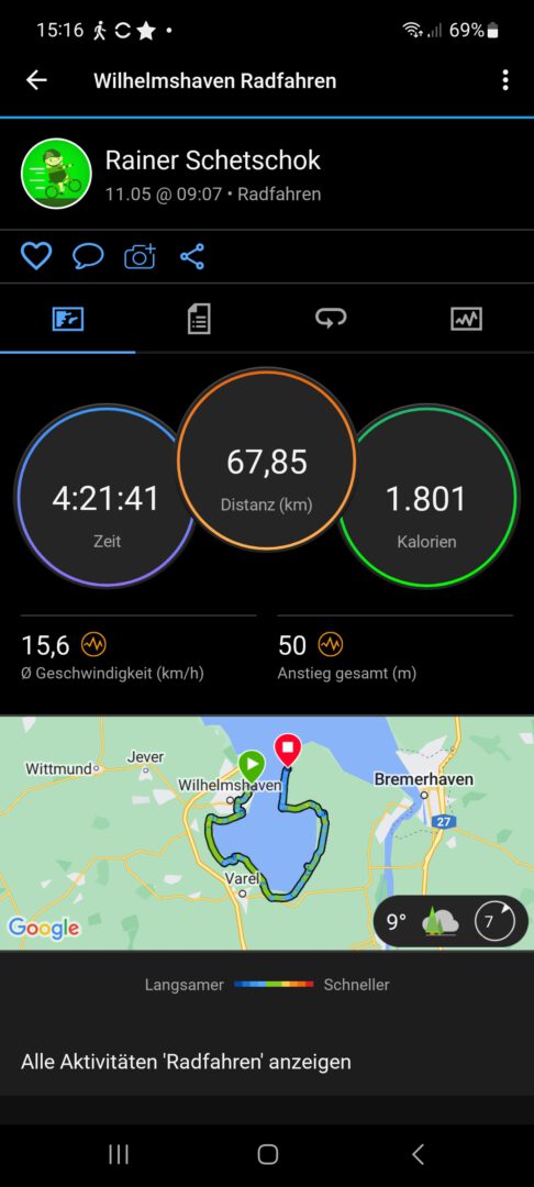 Das Protokoll unserer Strecke von heute, diesmal in einem Bild, mein Gerät mag mich wieder.