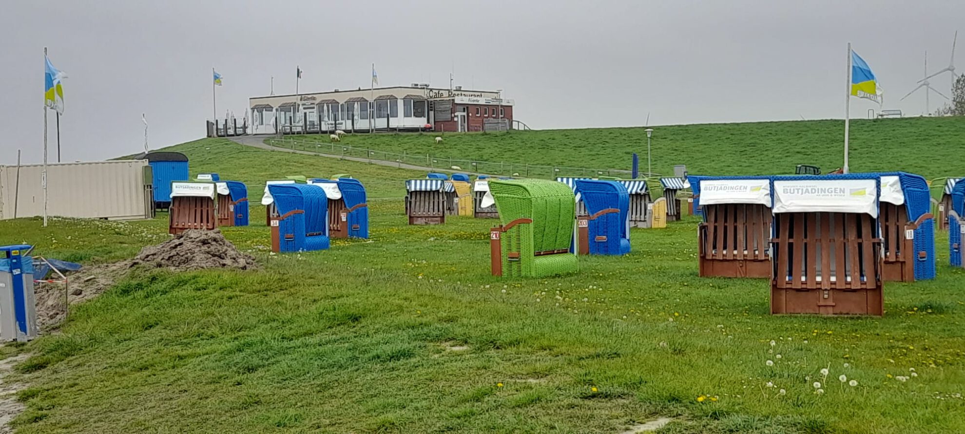 In Dangast angekommen prüfen wir gerade die Windrichtung. Geht so, NW, aber es bleibt trocken. Und kühl. Kurze Pause.