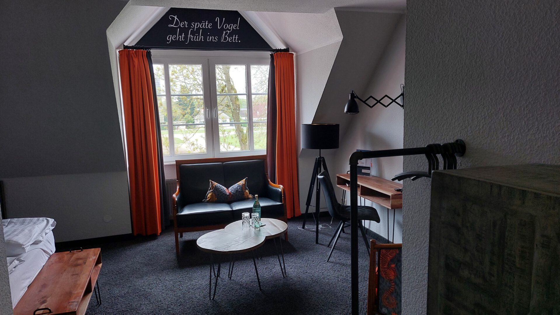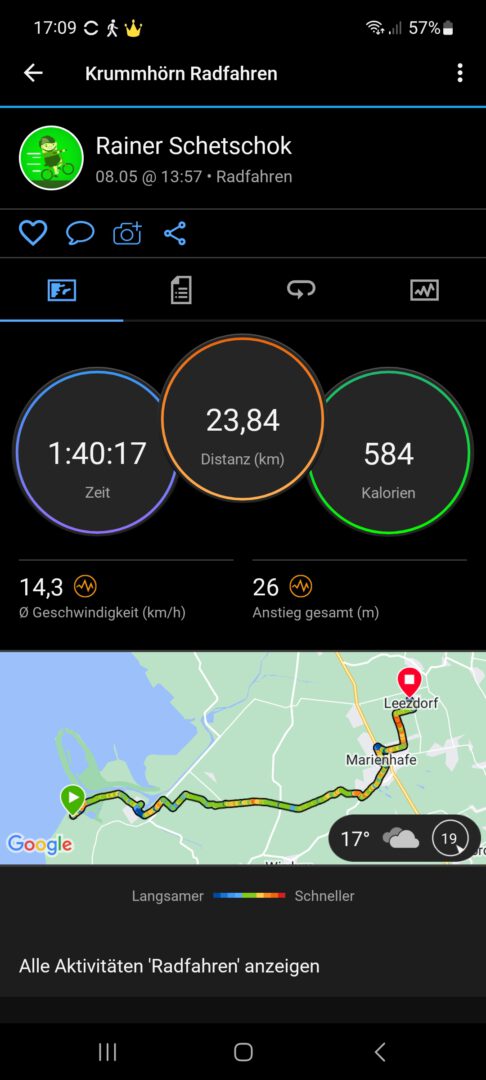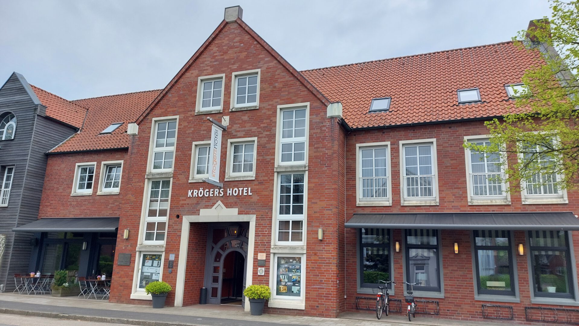 Wir sind in Leezdorf angekommen. Von Greetsiel an hat uns der Gegenwind geärgert, die teils holprigen Wege ebenfalls. Dafür hat uns die Sonne verwöhnt. Man muss es nehmen, wie es kommt. Nach einem isotonischen Kaltgetränk auf der Terrasse ist jetzt leichte Erholung angesagt. Nachher dann Abendessen im Hotel.