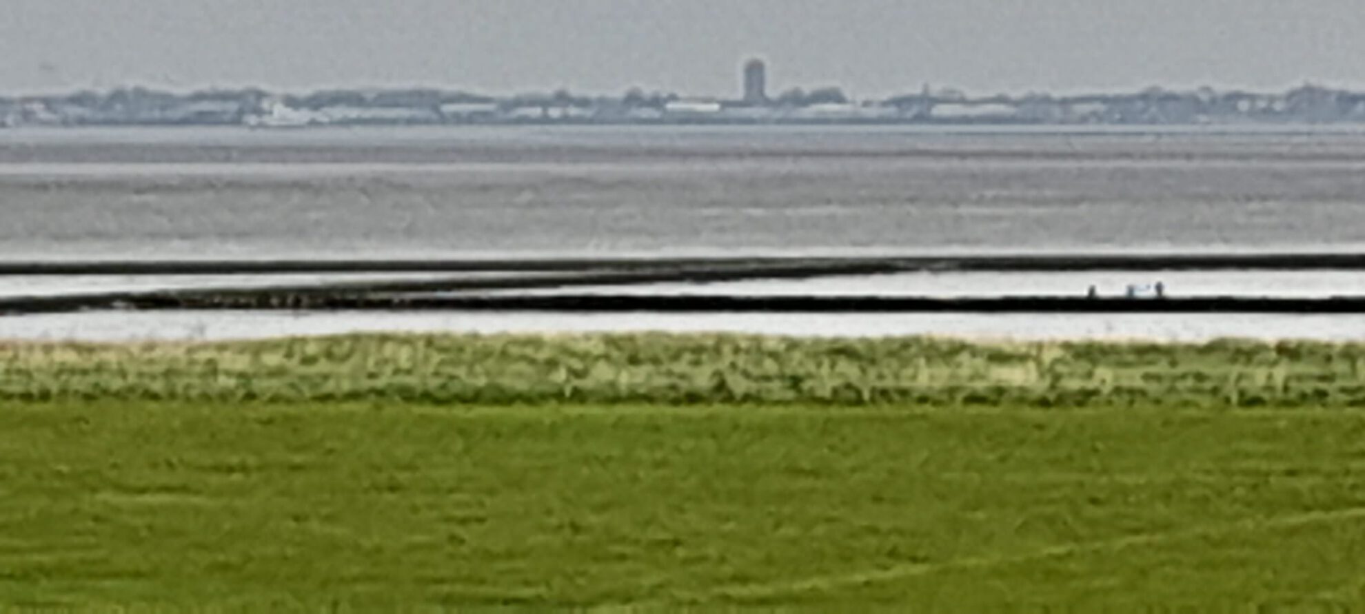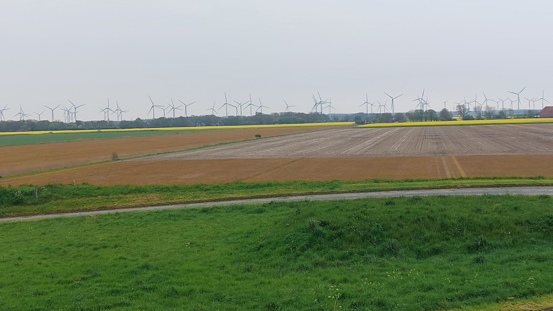 Nach 16 km stehen wir auf dem Deich westlich von Norden, das Wetter hält noch. Die Fotos werden nicht gut, aber man kann Norderney erkennen und die hier unzähligen Windräder.