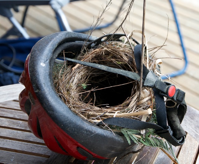 Gerds Fahrradhelm ist wieder aufgetaucht. Im Ferienhaus in Euronat. Und ist etwas zweckentfremdet worden (siehe Bild).