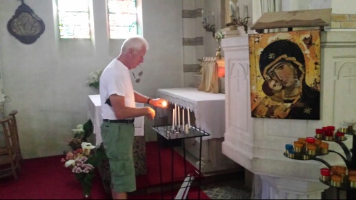 17.15: Wir sitzen nicht nur so Innenhof des Hotels herum, wir haben auch noch den Ort samt der Kirche angesehen. Und haben in gut ökumenischer Gemeinschaft eine Kerze angezündet.