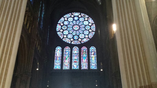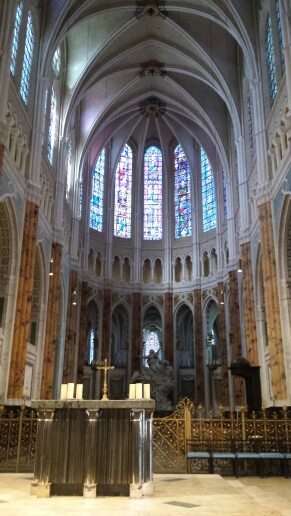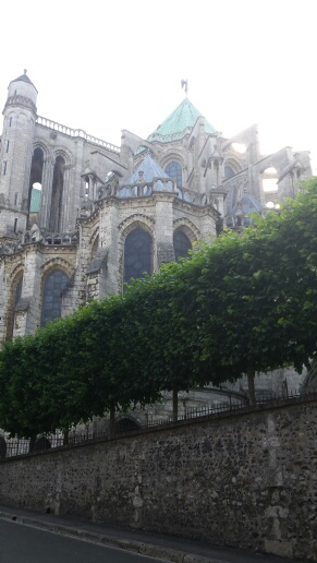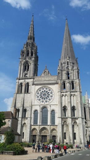 20.00: Wir sind noch einmal draußen gewesen, Besuch in der Kathedrale und etwas essen. Leider auch typisch für so eine Sehenswürdigkeit: Ab 6 werden die Bürgersteige hochgeklappt. Aber wir sind satt geworden, und es gibt noch Bilder von der Kathedrale. U. a. Ein Portal, eine Teil-Ansicht und das berühmte Blau von Chartres – so es denn ein Foto wiedergeben kann.