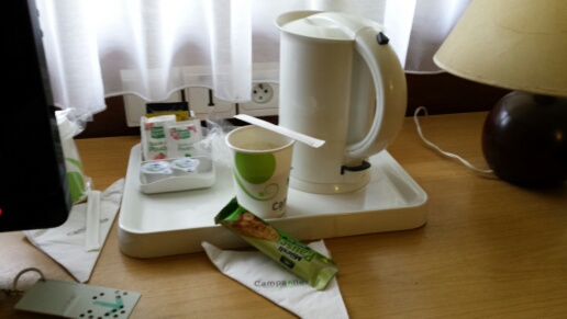 16.30: Nach einer kleinen Irrfahrt durch Nogent und Creil, bedingt durch schlechte bis nicht vorhandene Beschilderung und wenn, dann wieder nur für Lkw auf den großen Straßen, haben wir unser Hotel gefunden. Es liegt in Villiers St. Paul und ist wieder ein typisches Ubernachtungshotel. Aber die Zimmer sind in Ordnung, und man kann sich auch einen Kaffee kochen. Und: mangels Garage stehen die Räder wieder mit im Zimmer. Haben sie sich auch verdient. Denn bis hierher keine Probleme mit dem Rad und übrigens nur gutes Wetter, da kann man schon mal dankbar sein.