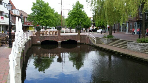 Die Bilder zeigen die Eisenbahn-Brücke, auf der wir auch die Ems überquert haben, die Fußgängerzone und den alten Hafen.