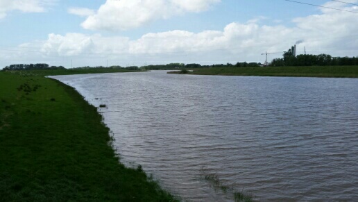 13.00 h : Hinter dem Deich und windgeschützt machen wir Mittagspause. Papenburg und auch die Meyer-Werft liegen hinter uns. Die Stadt selbst ist schön mit dem durchlaufenden Kanal. Die Weiden um den Ort allerdings auch.