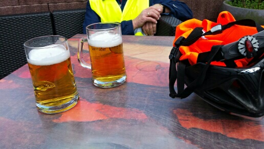 16.00 h : Nach 90 km sind wir in Hesel angekommen. Ein verschlafenes Nest etwa 16 km nordöstlich von Leer. Ein netter Empfang. Auch wenn erst ab 17.00 h geöffnet ist, fehlt es uns an nichts. Wir sitzen in der warmen Sonne und genießen das isotonische Kaltgetränk aus dem Sauerland.