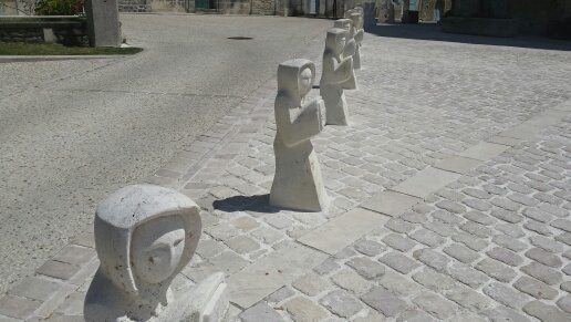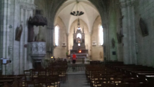 16.00: Die erste Etappe ist geschafft. Mehr als 90 km bei Hitze und ziemlich hügeliger Landschaft. Aber keine körperlichen Probleme. Vielleicht haben die Apostel vor der Kirche in Savinien ja das Ihre dazu beigetragen. Und die Kerze, die Gerd dort angezündet hat.