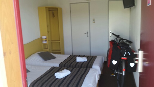 Wir sind jetzt in St. Jean d‘ Angely, in einem Motel fast an der Autobahn. (Der Wirt aus Tonnay hat uns leider noch gestern Abend versetzt. Schönen Gruß an Booking.Com.) Es ist wie in den USA. Man könnte ein Roadmovie drehen. Läge ja auch gar nicht so fern. Aber es hat eine Klimaanlage, und … siehe Bild.