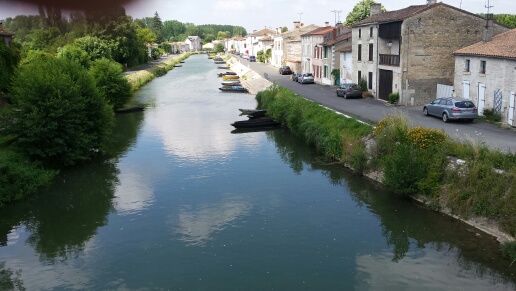 Die Strecke ist schön, aber anstrengend, denn wir haben Gegenwind. Gut, dass es hier noch Hecken gibt. Und schöne Aussichten wie auf die Sevre Niortaise bei Coulon.