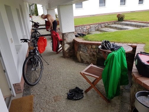 Landhotel Pathes Hof, so heißt unsere heutige Unterkunft in Volkenshagen, knapp 10 km östlich von Warnemünde. Es liegt mitten in der Landschaft, ist gemütlich und ansprechend. Mit Restaurant, und das ist auch gut so. Heute bitte nicht noch einmal durch den Regen, auch wenn es heute nur 65 km waren. Genug. Alles muss trocknen, und gut, dass wenigstens jetzt noch sich die Sonne zeigt.